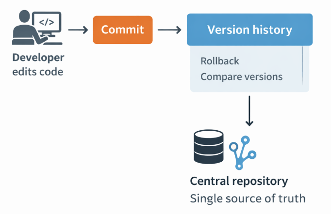 At its core, a version control system (VCS) is a software tool that helps a software team manage changes to source code over time. A VCS keeps track of every modification in a special kind of database. If a mistake is made, developers can turn back the clock and compare earlier versions of the code to help fix the mistake while minimizing disruption to all team members.