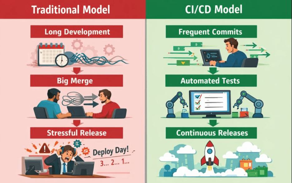 Traditionally, deployment was a stressful event. Teams would work in isolation for weeks or months, merging their code only at the very end. This often resulted in “merge hell,” where conflicts were rampant, and bugs were hard to trace.