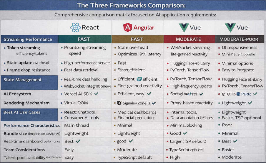- AI Context: Vue offers a sweet spot. It is more performant out of the box than unoptimized React for high frequency updates because of its precise dependency tracking, without the boilerplate complexity of traditional Angular.