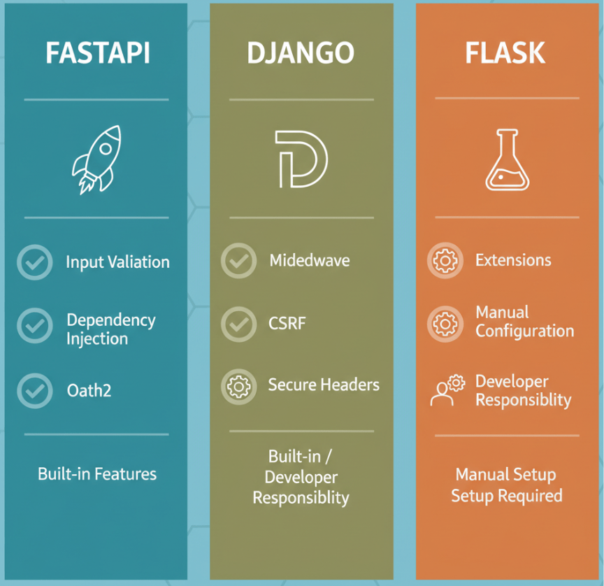- How to leverage built-in security features in frameworks like FastAPI, Django, and Flask.
