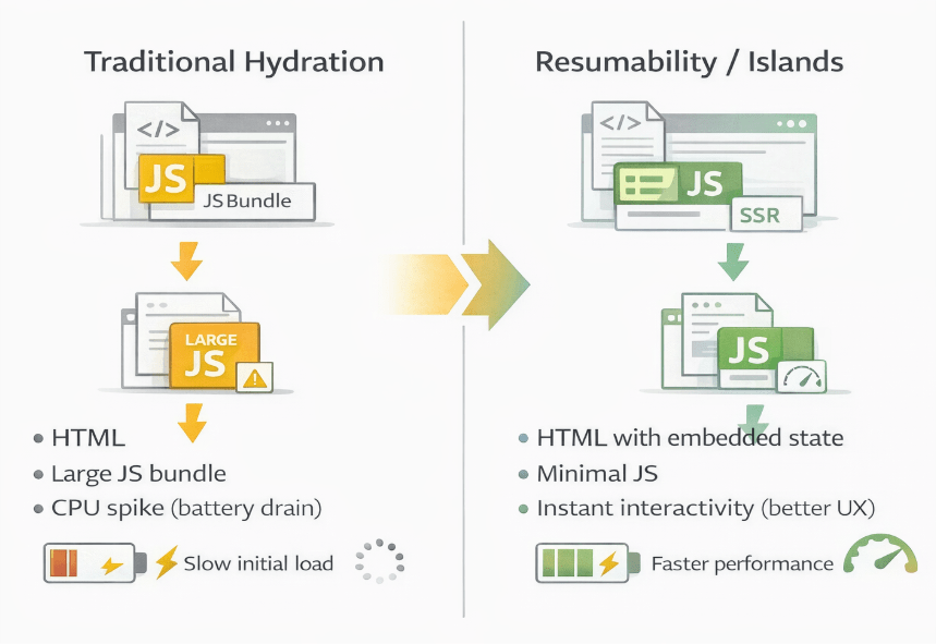 For the better part of a decade, the standard model for modern web apps has been “hydration.” You send a skeleton HTML page to the browser, then load a massive JavaScript bundle to “wake up” the page and make it interactive. While this enabled dynamic user experiences, it came at a heavy cost: slow Time to Interactive (TTI) and battery draining CPU usage on mobile devices.