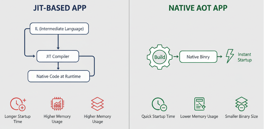 - Lightning-fast startup times: Since there is no JIT compilation step at startup, applications launch almost instantly. This is critical for serverless functions (like Azure Functions or AWS Lambda) where “cold start” latency can impact user experience.