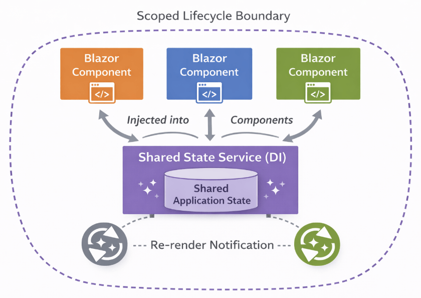 You can then inject this service into any component that needs it. When one component updates the state in the service, you can trigger events to notify other components to render. This pattern promotes a clean separation of concerns and makes your application more testable and scalable.