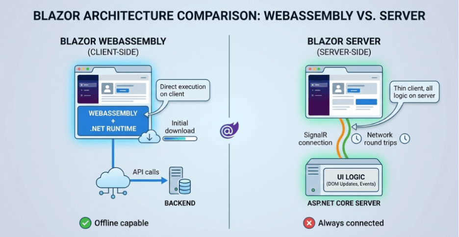 Before writing code, it is crucial to choose the right hosting model. Blazor offers two primary architectures, each with distinct tradeoffs regarding performance, latency, and scalability.